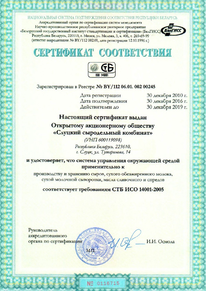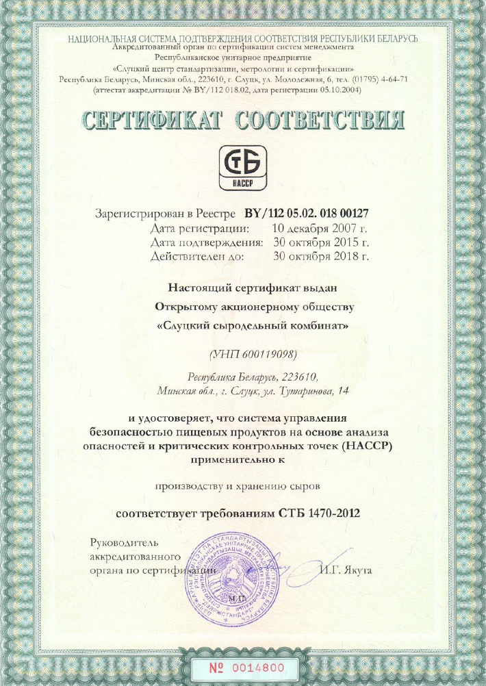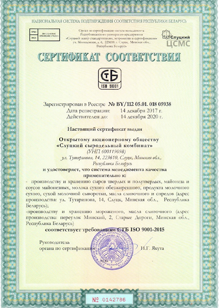 На предприятии сертифицированы 5 систем менеджмента качества: система менеджмента качества в соответствии с требованиями государственного стандарта СТБ ISO 9001-2015, СТБ ИСО 14001 (СОУС), СТБ ISO 18001 (СОУТ), СТБ ИСО 1470 (HACCP), а также система менеджмента безопасности пищевых продуктов в соответствии с требованиями международного стандарта ISO 22000.
